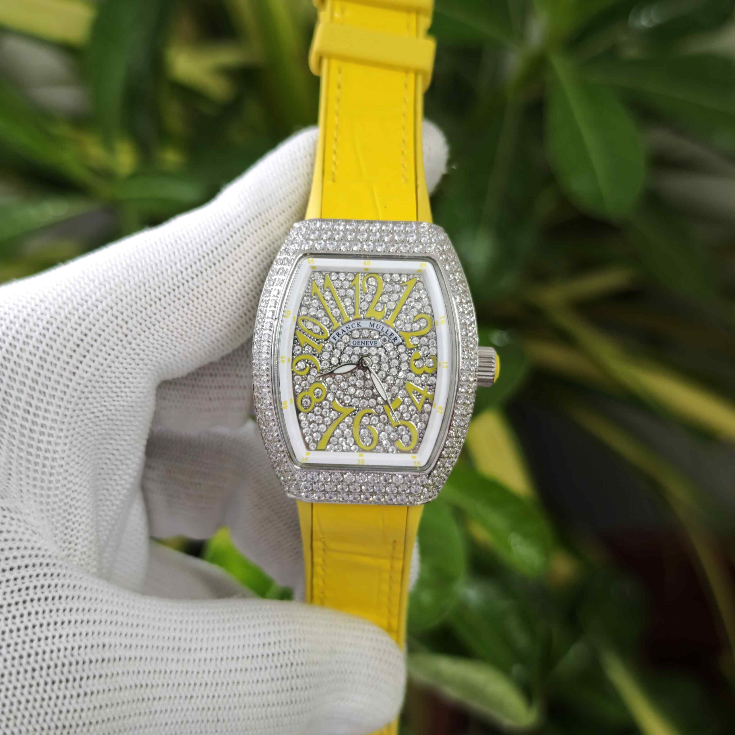 Franck muller cheap vanguard full diamond Steel Whte Diamond Dial Yellow Leather Strap
