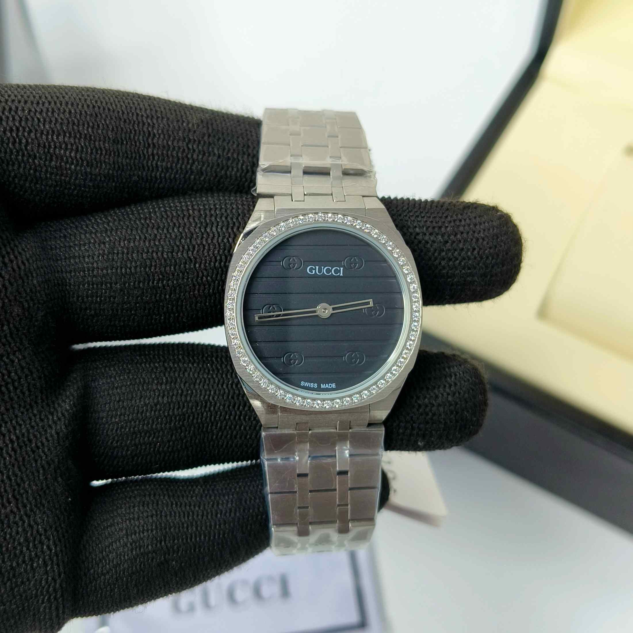 Gucci 25H Black Diamond Bazel Stainless Steel